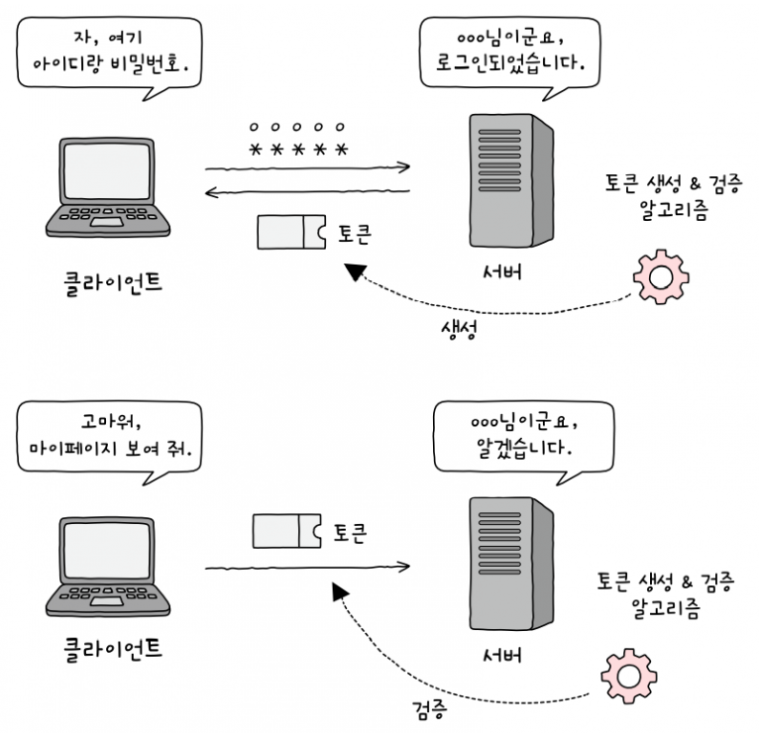 토큰 기반 인증방식이라 하면 주로 JWT(JSON Web Token) 방식을 사용한다. 사용자가 로그인을 하면 서버에서는 토큰을 발급하여 응답을 내려준다. 이때 이 토큰에 대한 정보를 서버에 별도로 저장하지는 않는다. 다음에 유저가 이 토큰과 함께 요청을 한다면 해당 토큰이 자신이 발급한 토큰이 맞는지, 변조되진 않았는지 등을 확인하고 인가해준다.