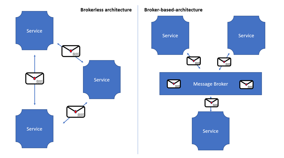 메시지 브로커를 설명하는 그림과 그림이다. 좌측은 브로커가 없을경우 통신하는 방법이다. 각각의 서비스가 직접적으로 연결되어있다. 서비스 수가 많아진다면 복잡도는 계속 증가할것이다.