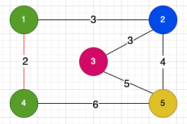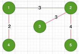 이제 다음으로는 2번 노드와 5번 노드를 잇는 가중치 4 간선을 선택했다.