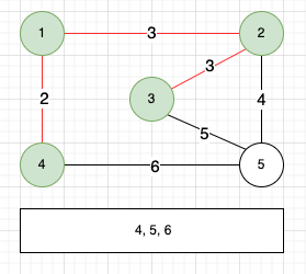 3번 정점도 기존 MST에 포함된 정점이 아니었으니 MST에 추가하고 연결된 간선을 우선순위 큐에 넣어준다. 다음으로는 5번 정점과 연결하는 비용 4의 간선을 선택한다.