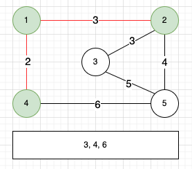 4번 정점은 기존 MST에 속한 정점이 아니었으니 MST에 추가해주고 연결된 간선을 우선순위 큐에 넣어주었다. 다음으로는 2번 정점과 연결하는 비용 3 간선을 선택한다.