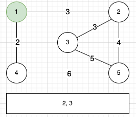 2번 정점 역시 기존 MST에 속하지 않았으니 MST에 추가하고 연결된 간선을 우선수위 큐에 넣어준다. 다음은 3번 정점과 연결하는 비용 3의 간선을 선택한다.