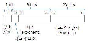 - 지수: 부호있는 정수. -127 ~ 128